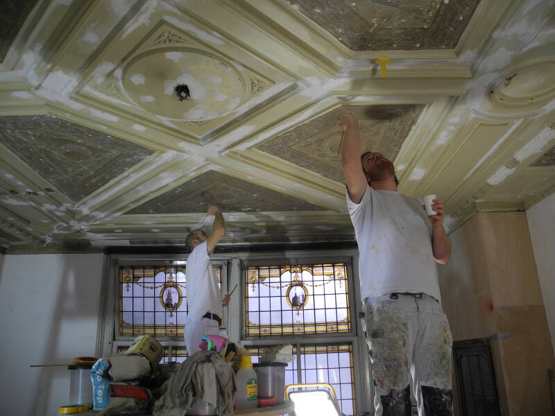 Na de sloop is niet alleen het mooie stucwerk tevoorschijn gekomen, maar het plafond bleek ook handbeschilderd te zijn. Decoratieschilders hebben het plafond zorgvuldig gerestaureerd.